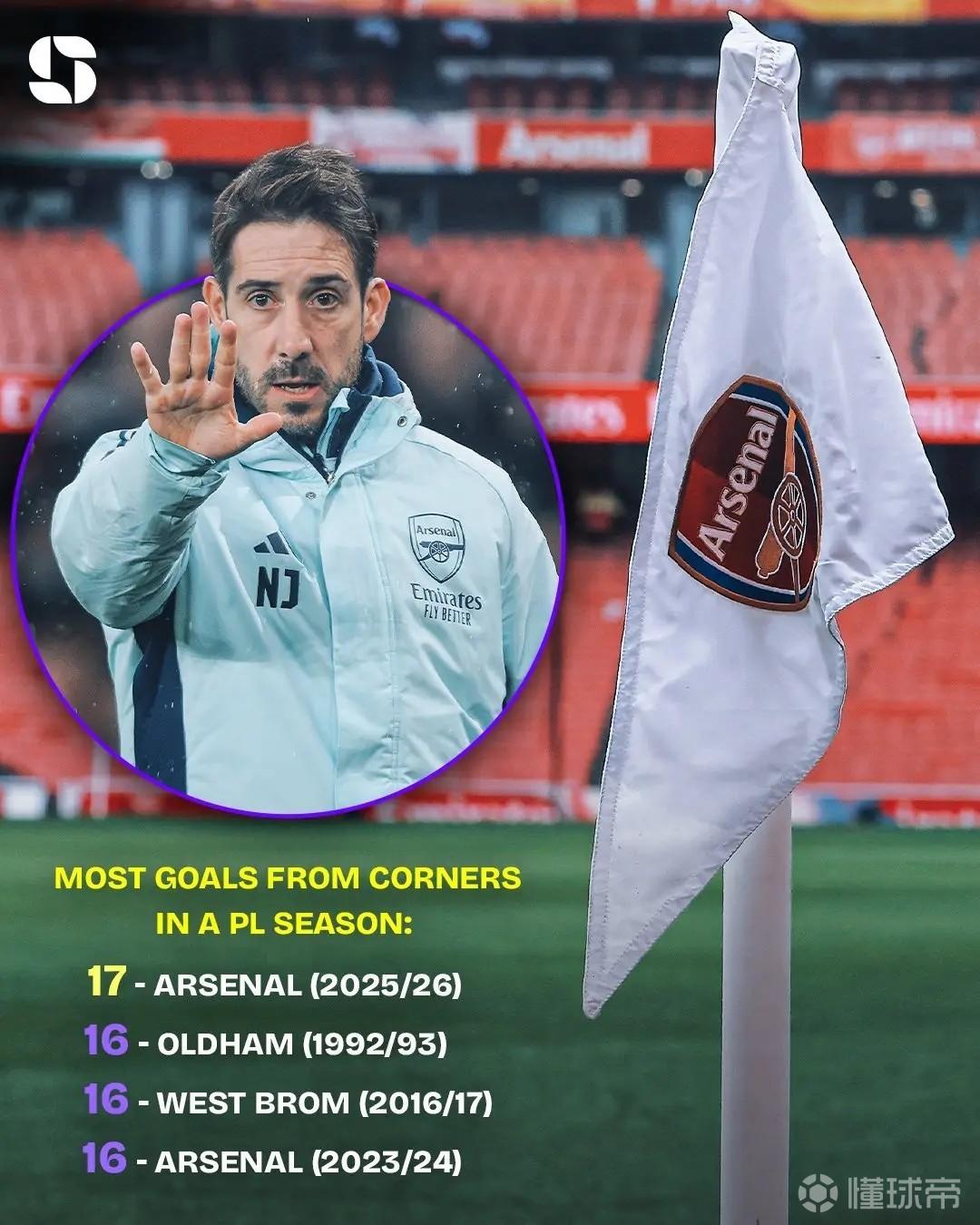 据Squawka统计,这是阿森纳本赛季英超通过角球打入的第17粒进球,创造了新的英超纪录。