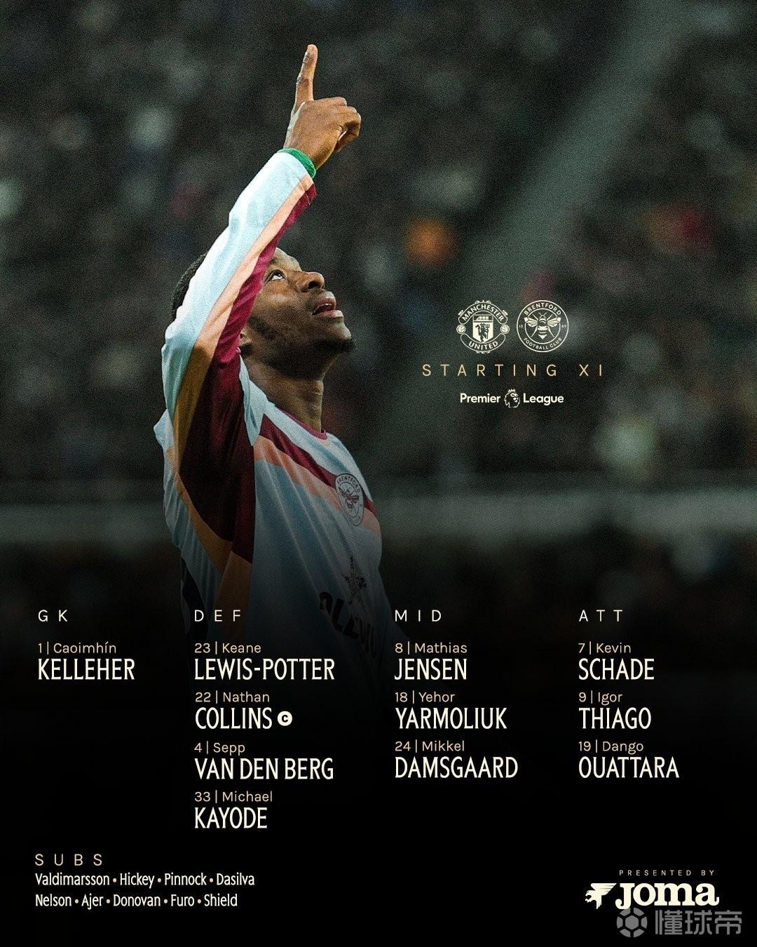 布伦特福德首发:1-凯莱赫、33-卡约德、4-范登贝尔赫、22-内森-科林斯、23-刘易斯-波特、18-亚尔莫柳克、8-延森、19-瓦塔拉、24-达姆斯高、7-沙德、9-伊戈尔-蒂亚戈