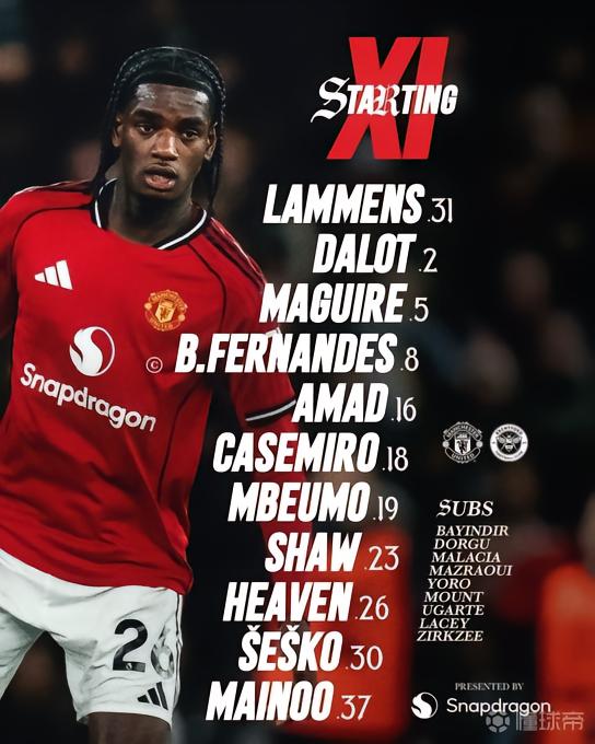 曼联首发:31-拉门斯、2-达洛特、5-马奎尔、26-海文、23-卢克-肖、37-梅努、8-B费、16-阿马德-迪亚洛、18-卡塞米罗、19-姆伯莫、30-谢什科
