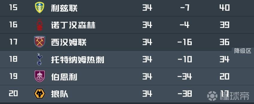 排名第15名的利兹联积40分,第16名的诺丁汉森林积39分,而西汉姆联目前积36分,在接下来的比赛中,热刺会与利兹联直接对话。