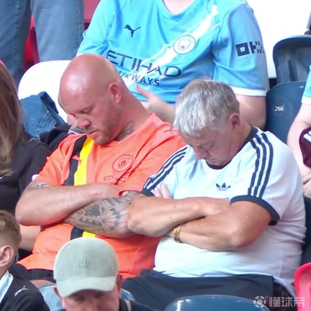 看困了,曼城vs南安普顿的比赛中多名球迷在看台上睡觉